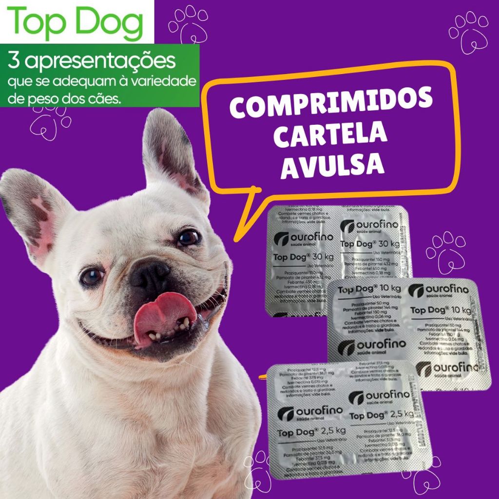 A MANADA ANIMAL é um marketplace de produtos veterinários. É a escolha certa para tutores que prezam pela qualidade dos produtos que seu animal necessita. Tudo com o suporte de uma equipe de veterinários e gestores com mais de 10 anos de experiência no mercado. Fique tranquilo, todos os nossos produtos são originais, adquiridos através de distribuidores credenciados! Ah, e todas as vendas acompanham nota fiscal! MANADA ANIMAL, Tranquilidade pra você, cuidado para ele! _____________________________________ Indicações: Top Dog é um vermífugo palatável, indicado para o controle de parasitas internos (helmintos) com atuação em vermes redondos (nematódeos) e vermes chatos (cestódeos). Top Dog é também indicado para o tratamento da Giardíase (causada pelo protozoário Giardia sp). Top Dog é de uso exclusivo para cães. Espectro de ação de Top Dog: Nematódeos Ancylostoma caninum, Toxocara canis. Cestódeos Dipylidium caninum. Protozoários Giardiasp. Modo de uso e dosagens: Top Dog 2,5 kg (250 mg) Administrar pela via oral 1 comprimido palatável para cada 2,5 kg de peso corporal. Top Dog 10,0 kg (1000 mg) Administrar pela via oral 1 comprimido palatável para cada 10 kg de peso corporal. Top Dog 30,0 kg (3000 mg) Administrar pela via oral 1 comprimido palatável para cada 30 kg de peso corporal.