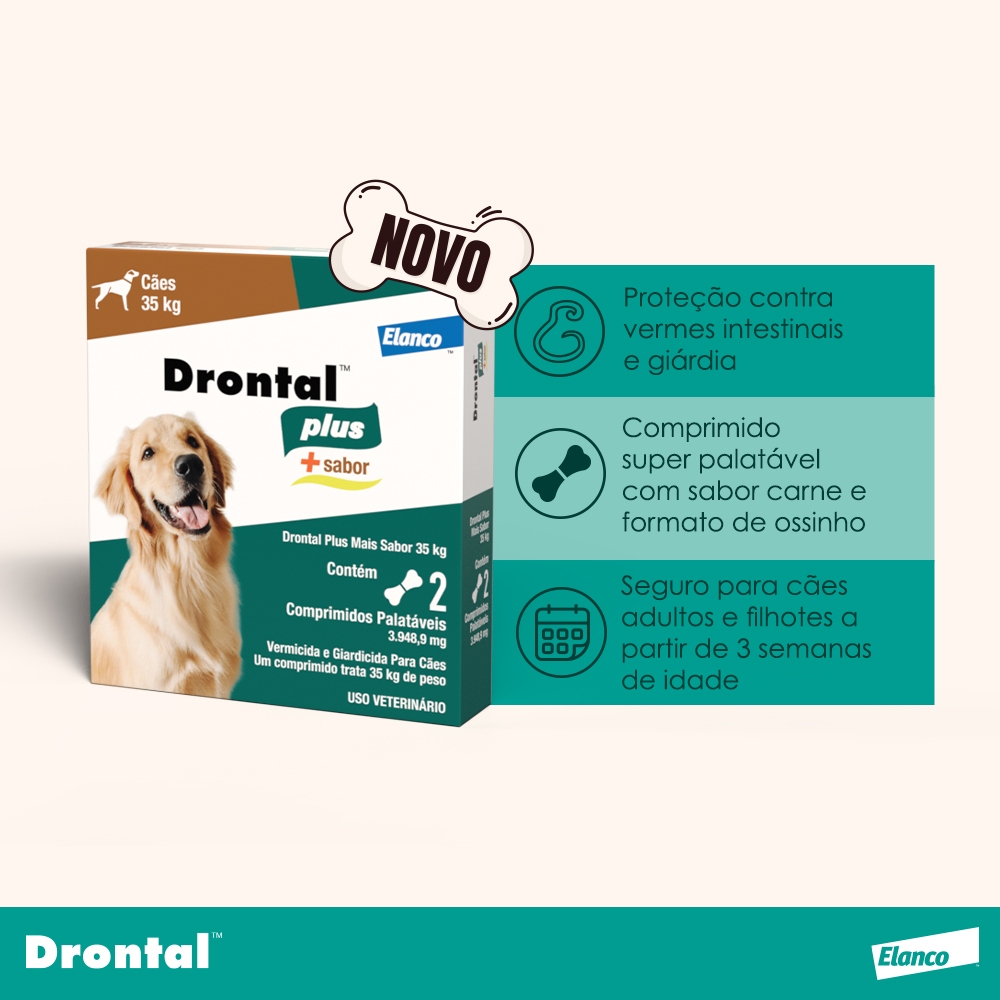 Vermífugo Drontal Plus Cães 35kg C/ 2 Comprimidos O Vermífugo Drontal Plus é a proteção eficaz contra vermes e giárdia Drontal Plus elimina vermes redondos e chatos , tem alta eficácia contra giárdia. Drontal plus sabor carne é especialmente indicado para o tratamento e controle das verminoses intestinais e da giardíase em cães, apresentando excelente atividade contra os seguintes parasitos: Cestóides (vermes chatos): Taenia multiceps, Taenia pisiformis, Dipylidium caninum, Taenia ovis, Echinococcus granulosus, Taenia taeniaeformis, Echinococcus multilocularis, Joyeuxiella pasqualei, Mesocestoides spp., Taenia hydatigena. Nematódeos (vermes redondos): Ancylostoma braziliense, Ancylostoma caninum, Toxocara canis, Toxascaris leonina, Trichuris vulpis, Uncinaria stenocephala. Protozoários: Giardia spp. Modo de usar Drontal plus sabor carne possui moderno componente palatabilizante que facilita a aceitação do comprimido pelos animais. Caso necessário, os comprimidos podem ser misturados à ração ou à carne, sendo muito bem tolerado e dispensando regime especial ou jejum prévio. Comprimidos de 2.718mg: 1 comprimido trata 35Kg de peso, conforme tabela abaixo: Peso do animal Dosagem Cães de 15Kg a 17,5Kg 1/2 de comprimido de 17,6Kg a 35Kg 1 comprimido Para o tratamento das verminoses intestinais, Drontal® plus sabor carne deve ser administrado por via oral em dose única. Contra a giardíase, administrar o produto na dosagem recomendada uma vez por dia, durante três dias consecutivos. Composição Cada comprimido contém: Comprimidos para tratar 35Kg de peso: Praziquantel ......................................... 175mg Pamoato de pirantel .............................. 504mg Febantel ................................................ 525mg Excipiente q.s.p ....................................... 2.718mg