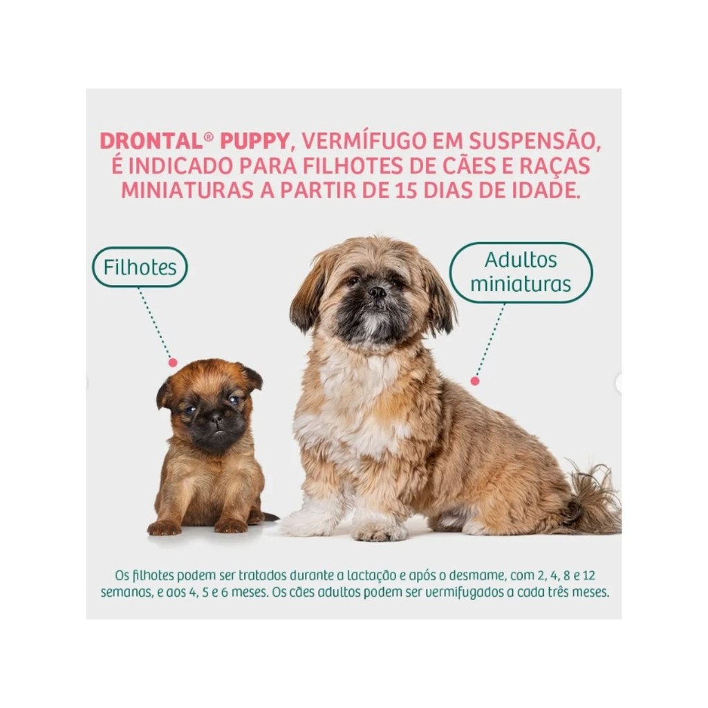 Validade: Janeiro/2028 O Vermífugo Drontal Puppy para Cães Filhotes oferece uma proteção essencial para o seu filhote, permitindo que ele brinque e cresça sem a preocupação com vermes. Sua fórmula em suspensão, acompanhada de uma seringa dosadora, torna a administração fácil e livre de amargor, garantindo uma experiência tranquila para seu pet. Drontal age rapidamente, com absorção em até 1 hora e eliminação em até 24 horas, proporcionando alívio eficaz. Indicado para filhotes de cães e raças miniaturas a partir de 15 dias de idade, pode ser utilizado durante a lactação e após o desmame, seguindo um cronograma de tratamento que abrange as semanas e meses cruciais do desenvolvimento do seu filhote. Com ação rápida, o Drontal Puppy Filhote é eficaz após um único tratamento. Então, após digestão e metabolização, a solução começa a fazer efeito de 8 a 12 horas, com eficácia máxima a partir de 24 horas. Composição: Cada 100ml contém: Febantel..................1,50g Pamoato de pirantel.......1,44g Excipiente q.s.p..........100,00ml Modo de Uso: Quanto dar de Drontal Puppy para filhotes? Para encontrar a dosagem certa do vermífugo do seu pet, o tutor precisará fazer um cálculo bastante simples. Segundo a bula Drontal Puppy, o recomendado é aplicar 1ml do remédio para cada quilo do animal de estimação que estiver com vermes. Para tratar as verminoses intestinais, basta administrar uma dose de Drontal Puppy. Já contra a giardíase, a aplicação recomendada é uma dose diária do medicamento por três dias consecutivos. Não se esqueça de consultar o médico-veterinário para saber quantas vezes dar Drontal Puppy 20ml. Apresentação: Frasco 20ml.