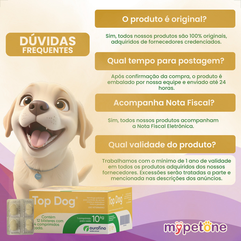 Top Dog® Vermífugo Palatável Ourofino Mantenha a saúde e o bem-estar do seu cão com o Top Dog® Ourofino, um vermífugo palatável de amplo espectro indicado para o combate eficaz de vermes redondos, vermes chatos e giardíase. Com fórmula moderna e segura, é ideal para cães de todas as idades e tamanhos, respeitando a dose indicada conforme o peso do animal. Indicado para: - Vermes redondos (Ancylostoma caninum, Toxocara canis) - Vermes chatos (Dipylidium caninum) - Protozoários (Giardia sp.) Benefícios do Top Dog®: - Alta palatabilidade: fácil aceitação pelos cães - Ação rápida e eficaz contra verminoses e giardíase - Seguro e com ampla margem terapêutica - Diferentes apresentações conforme o peso do pet - Pode ser usado em protocolos estratégicos de vermifugação Fácil administração: - Top Dog 2,5 kg: 1 comprimido para cada 2,5 kg - Top Dog 10 kg: 1 comprimido para cada 10 kg - Top Dog 30 kg: 1 comprimido para cada 30 kg Modo de uso: Via oral. A dosagem varia conforme o peso do animal e a apresentação escolhida. Consulte o médico-veterinário para definir o melhor protocolo, especialmente em casos de giardíase, onde o tratamento é por três dias consecutivos. Recomendações importantes: - Manter o ambiente sempre limpo para evitar reinfestações - Vermifugar todos os animais da casa simultaneamente - Não utilizar em filhotes com menos de duas semanas ou em fêmeas gestantes/lactantes sem orientação profissional