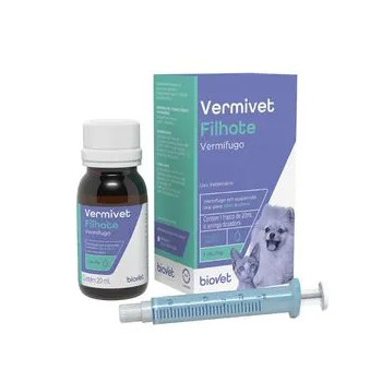 Vermivet Filhote 20ml - Biovet VERMÍFUGO EM SUSPENSÃO ORAL DE AMPLO ESPECTRO PARA CÃES E GATOS Vermivet Filhote 20ml Biovet é um produto composto de Pamoato de P1r4ntel, Pr4z1quantel e Feb4nte1 que garantem amplo espectro de ação contra formas adultas e larvais dos principais cestóides e nematóides dos cães e gatos, com grande margem de segurança, já que a dose t0x1ca é extremamente superior à recomendada. COMO USAR Vermivet Filhote 20ml Biovet deve ser administrado aos cães e gatos exclusivamente por via oral. Não há necessidade de jejum ou alimentação especial quando de sua administração. Posologia Vermivet Filhote 20ml Biovet deve ser administrado por via oral aos 15 dias, 1º, 2º, 3º, 4º, 5º e 6º mês de idade. Recomenda-se administrar 1 mL para cada kg de peso do cão ou gato, o que corresponde a 14,5 mg. A vermifugação dos filhotes é fundamental para seu desenvolvimento físico e imunológico. Conforme o tipo e o grau de infestação a posologia pode ser alterada a critério. INDICAÇÕES Vermivet Filhote 20ml Biovet é um vermífugo de amplo espectro e portanto indicado para combater as formas adultas e larvais dos principais cestóides e nematóides dos cães e gatos. ORIENTAÇÕES COMPLEMENTARES Dipylidium caninum tem como hospedeiro intermediário as pulgas e desta forma aconselha-se que sejam combatidas. O controle das verminoses depende da vermifugação, assim como da lavagem e desinfecção dos ambientes de criação. APRESENTAÇÃO Frasco com 20 ml, acompanhado de seringa dosadora. Atenção: Antes de utilizar sempre leia as instruções que acompanham o produto (bula ou rótulo). As informações aqui disponibilizadas são fornecidas pelos laboratórios no momento da inclusão do produto nesta página. Informações sujeitas a divergências entre rótulo ou bula e este conteúdo. Caso haja diferença entre as informações aqui apresentadas e rótulo ou bula, prevalecerá sempre a informação do rótulo ou bula que acompanha o produto. Sempre leia a bula antes de utilizá-lo.