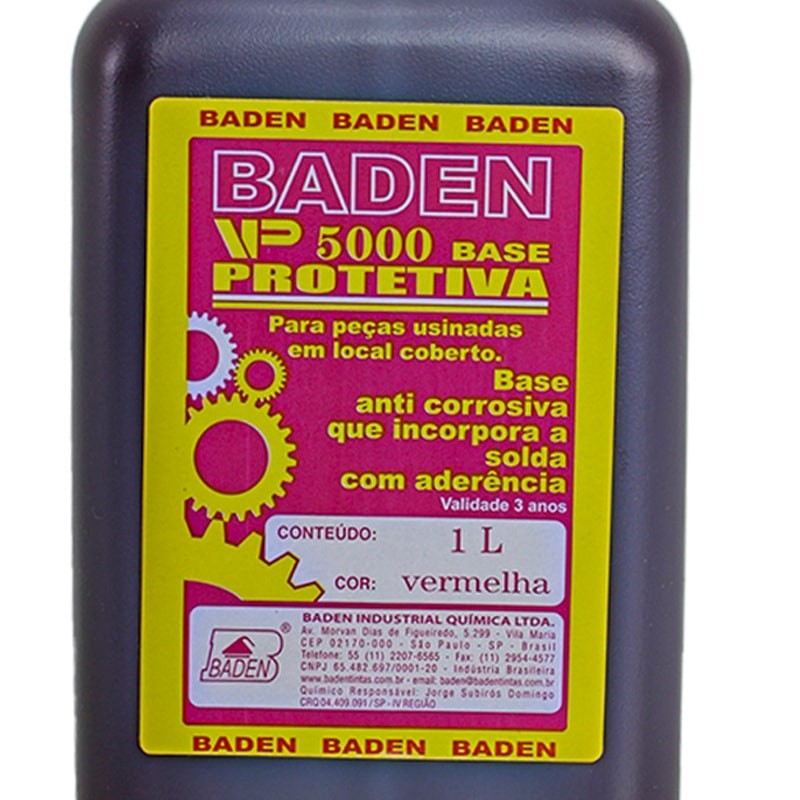 Verniz Anti Oxidante Protetivo Vermelho com 1 litro VP5000 - Baden Proteção micrométrica sobre peças metálicas, inibindo o ataque de ferrugem. Permite soldar peças sem removê-lo. Verniz protetivo para peças usinadasem local coberto VP 5000. Base anticorrosiva que incorpora a solda comaderência. Finalidade Proteção micrométrica sobre peçasmetálicas, inibindo o ataque de ferrugem. Permite soldar peças sem removê-Io. Suporta até 120ºC. Características Rendimento: 25 m por litro com secagem rápida. Cor: Vermelho Conteúdo: 1Litro Superfície de Aplicação:Em qualquer tipo de metal com a exceção do inox. Não orientamos a sua diluição. Embalagem: 1L Cor: Vermelho. Imagens Meramente Ilustrativas