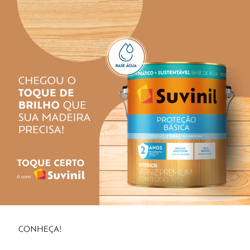 Os vernizes são essenciais para realçar a cor e a beleza da madeira, além de conservá-la. Por isso, contar com um verniz brilhante à base de água é essencial para deixar sua casa ainda mais bonita. O Suvinil Proteção Básica oferece diversos benefícios para a pintura do seu lar. Nosso verniz incolor garante um brilho protetor a diversos pontos de madeira na sua casa, sendo a melhor opção para todos os cômodos. Com acabamento brilhante, o verniz para madeira da Suvinil é um produto pronto para o uso. Isso significa que você só precisa abrir, misturar e aplicar na superfície desejada. O verniz incolor brilhante da Suvinil está disponível em dois tipos de embalagem: galões de 900 ml ou 3,6L. O primeiro consegue cobrir superfícies de madeira de até 20 m² e o segundo, até 90 m². Por isso, é um produto de alto rendimento, perfeito para renovar sua casa. Secagem rápida Imagine contar com um verniz brilhante à base de água que ainda tem secagem rápida? O Suvinil Proteção Básica oferece essa característica que traz mais praticidade na hora de renovar a sua casa. Ele fica seco para o toque em apenas trinta minutos. Muito bom, certo? Acabamento: -Brilhante Secagem: -Ao toque: 30 min -Entre demãos: 2 horas -Final: 3 horas Rendimento acabado: -900ml: Até 20 m² Quantidade necessária de demãos: -2 a 3