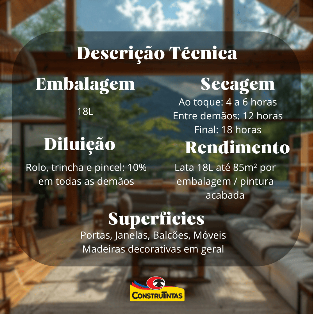 Características:Volume: 18LAcabamento: BrilhanteCor: MognoTipo: TingidorAplicações: Madeiras internas e externasBenefícios:Acabamento brilhante e com tonalidade mognoAlto poder de penetraçãoRápida secagemExcelente resistência às intempériesInstruções de uso:A superfície deve estar limpa, seca e livre de poeira, óleos, graxas e outros contaminantes.Lixar a superfície com lixa fina para nivelar e remover imperfeições.Aplicar o verniz com pincel ou rolo, realizando movimentos circulares suaves.Aguardar a secagem completa do verniz antes de aplicar a segunda demão.Observações:O rendimento prático do produto pode variar em função do método de aplicação, geometria da superfície, rugosidade e absorção da superfície, espessura da camada de produto depositada, condições atmosféricas e técnica de aplicação.Evite a aplicação do produto em superfícies quentes ou úmidas.Use luvas de proteção e óculos de segurança ao manusear o produto