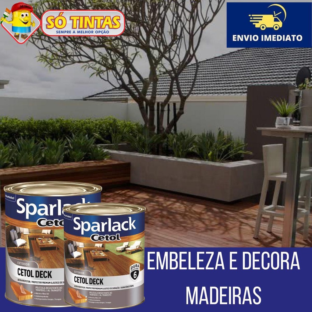 Imagine ter decks e móveis de jardim que não apenas embelezam seu espaço, mas também ficam impecáveis por até 6 anos. Com uma proteção superior contra sol, chuva, fungos e bolor, suas madeiras estarão sempre radiantes e bem cuidadas. Aplique o Verniz Sparlack Cetol Deck e desfrute de um acabamento deslumbrante e duradouro. Sua fórmula especial cria uma película elástica que acompanha os movimentos naturais da madeira, evitando fissuras e garantindo uma beleza sem igual. Benefícios: •Durabilidade Incomparável: Até 6 anos de proteção contra os rigores do clima. •Flexibilidade Superior: O verniz se adapta às mudanças da madeira, evitando trincas e descascamentos. •Resistência ao Tráfego: Ideal para áreas com grande circulação de pessoas, mantendo a beleza da superfície. •Hidrorepelente: Protege sua madeira contra a umidade e chuvas, prolongando sua vida útil. •Proteção Antifúngica: Ação eficaz contra fungos e bolor, garantindo um ambiente saudável. •Fácil Aplicação: Pronto para uso, sem necessidade de diluição. Apenas aplique com um pincel ou trincha! Dados Técnicos Identificação do Produto: •Nome do Produto: Verniz Sparlack Cetol Deck •Marca: Sparlack •Embalagem: 900ml Características do Produto: •Classificação: Verniz •Acabamento: Semi-brilho •Cor: Transparente (levemente amarelada) •Rendimento: Até 4 m² por demão Aplicação: •Superfícies: Ideal para decks, varandas e móveis de jardim. •Número de Demãos: oMadeira nova: 3 demãos oRepintura: 1 a 2 demãos •Secagem: oAo toque: 2-3 horas oEntre demãos: 24 horas oSecagem completa: 24 horas Composição: •Componentes Principais: oResinas alquídicas especiais oMicrobicida oPigmentos transparentes absorvedores de raios UV oCargas minerais funcionais oAguarrás e aditivos Propriedades: •Hidrorepelente: Sim •Proteção contra fungos e bolor: Sim •Filtro UV: Máximo •Flexibilidade: Forma uma película elástica que não trinca e não descasca. •Durabilidade: Até 6 anos sob condições adequadas. Instruções de Uso: •Diluição: Produto pronto para uso, não diluir. •Ferramenta de Aplicação: Pincel ou trincha de cerdas macias. •Preparação da Superfície: A madeira deve estar seca e limpa. Aplicar em todas as faces da madeira para melhor proteção. Aplicação Passo a Passo: 1.Preparação da Superfície: oLimpeza: Certifique-se de que a madeira esteja limpa, seca e livre de sujeira, poeira ou óleo. oLixamento (se necessário): Se a superfície estiver áspera ou com acabamento anterior, lixe levemente para uniformizar. Retire a poeira do lixamento com um pano seco. 2.Condições de Aplicação: oAplique o produto em um dia seco e ensolarado, com temperatura entre 10°C e 35°C. oEvite aplicar em dias chuvosos ou com umidade alta. 3.Aplicação do Verniz: oDemão Inicial: Com o pincel ou trincha, aplique a primeira demão do verniz, cobrindo todas as faces da madeira. oSecagem: Deixe secar por 24 horas. oDemãos Adicionais: Aplique mais 2 demãos, sempre respeitando o intervalo de secagem de 24 horas entre cada uma. 4.Verificação: oApós a última demão, aguarde 24 horas para a secagem completa antes de expor a madeira ao tráfego ou à umidade. 5.Limpeza: oLimpe as ferramentas utilizadas com aguarrás imediatamente após o uso. Principais perguntas: Acompanha nota fiscal? Sim, todos os nossos produtos são enviados com nota fiscal. O envio é por Correios? Pode ser enviado por Correios ou por transportadora privada, isso vai depender da disponibilidade das transportadoras que atendem o seu endereço. Porque não posso comprar mais de 4 unidades no mesmo pedido? Infelizmente há uma limitação por parte das transportadoras. Elas enviam apenas 4 unidades em cada pedido devido às dimensões e peso do pacote. Para mais unidades, você vai precisar fazer mais de um pedido, respeitando o limite máximo de 4 por pedido. Só Tintas, sempre a melhor opção. Somos a maior rede de lojas de tintas no estado do Rio de Janeiro. Desde 1977, a Só Tintas atua no Rio de Janeiro oferecendo os melhores produtos e soluções em pintura imobiliária, automotiva e industrial. Somos uma empresa familiar que começou em Teresópolis e hoje temos mais de 30 lojas físicas. Trabalhamos de forma ética e transparente, com o principal objetivo de proporcionar aos nossos clientes um atendimento de excelência, provendo as melhores soluções. Nossa missão é levar cor para a vida das pessoas. Por isso a Só Tintas é Sempre a Melhor Opção