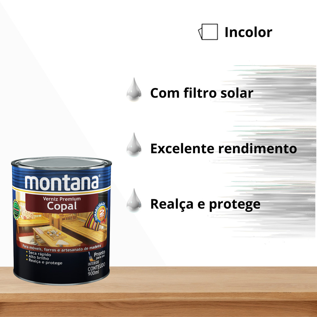 O Verniz Premium Copal dá mais brilho e vida para a superfície, garantindo excelente durabilidade e proteção aos diversos tipos de madeira de uso interno. O que é Verniz Premium Copal? O Verniz Premium Copal é um verniz transparente de acabamento brilhante e longa durabilidade interna, desenvolvido com resina alquídica de excelente desempenho e um conjunto de matérias-primas de elevada qualidade. Para que serve o Verniz Premium Copal? A função do Verniz Premium Copal é proteger superfícies de madeira em ambientes internos, tais como móveis, forros e peças de artesanato, conferindo acabamento brilhante, realçando a coloração natural e protegendo contra umidade, raios solares e intempéries. Quando utilizar o Verniz Premium Copal? A aplicação do Verniz Premium Copal é indicada para superfícies de madeira aplainadas, lixadas ou rústicas, como portas, janelas, forros, estruturas de telhado, artesanatos, móveis, etc., utilizadas em ambientes internos. Como utilizar o Verniz Premium Copal? A peça ou superfície a ser envernizada com o Verniz Premium Copal deve estar seca, livre de partículas soltas, sem mofo e isenta de contaminantes, tais como óleos, ceras e graxas. Madeiras novas Antes da aplicação do verniz, lixe a madeira na direção dos veios e elimine toda a poeira proveniente do lixamento. Madeiras envelhecidas (acinzentadas) Para superfícies ou peças sem nenhum tipo de pintura, primeiramente aplique o tratamento ClariDeck para restaurar a tonalidade e a textura natural da madeira. Em seguida, siga os mesmos passos da madeira nova para a aplicação do verniz. Madeiras envernizadas ou com stain Para madeiras em boas condições, efetue o lixamento (com uma lixa de grana fina) da superfície e aplique o verniz. Para madeiras em más condições, remova completamente o acabamento anterior utilizando Striptizi Gel (removedor de esmaltes, vernizes e stains). Após a remoção, retire totalmente os resíduos do removedor e prossiga como madeira nova. Madeiras resinosas Lixe a madeira na direção dos veios e aplique duas demãos de Isolare base solvente (verniz isolante) antes da aplicação do Verniz Premium Copal, para evitar exsudação (migração) dos extrativos das madeiras resinosas e o retardamento da secagem do verniz. Esse processo é recomendado para madeiras Cumaru, Ipê, Peroba, Angelim, Itaúba, Jatobá, Maçaranduba, entre outras madeiras resinosas. Para aplicação com uso de trincha ou rolo, o verniz já vem pronto para uso. Para aplicação com pistola, a diluição máxima é feita com 5% de Aguarrás Montana. O produto não é recomendado para madeiras verdes ou úmidas. Por que usar o Verniz Premium Copal da Montana? Após a secagem, o Verniz Premium Copal da Montana, fabricado com base solvente, forma uma película que embeleza e enobrece a madeira sem alterar sua coloração natural, além de proteger e realçar os veios da superfície e apresentar: - fácil aplicação; - ótimo rendimento; - secagem rápida; - ótimo alastramento; - excelente durabilidade; - boa resistência ao atrito. O produto já vem pronto para uso e pode ser aplicado em superfícies de madeira em ambiente interno com pistola, rolo ou trincha. Rendimento: até 5,75 m² Siga atentamente as orientações da embalagem para garantir o melhor desempenho do verniz. Pintura e acabamento