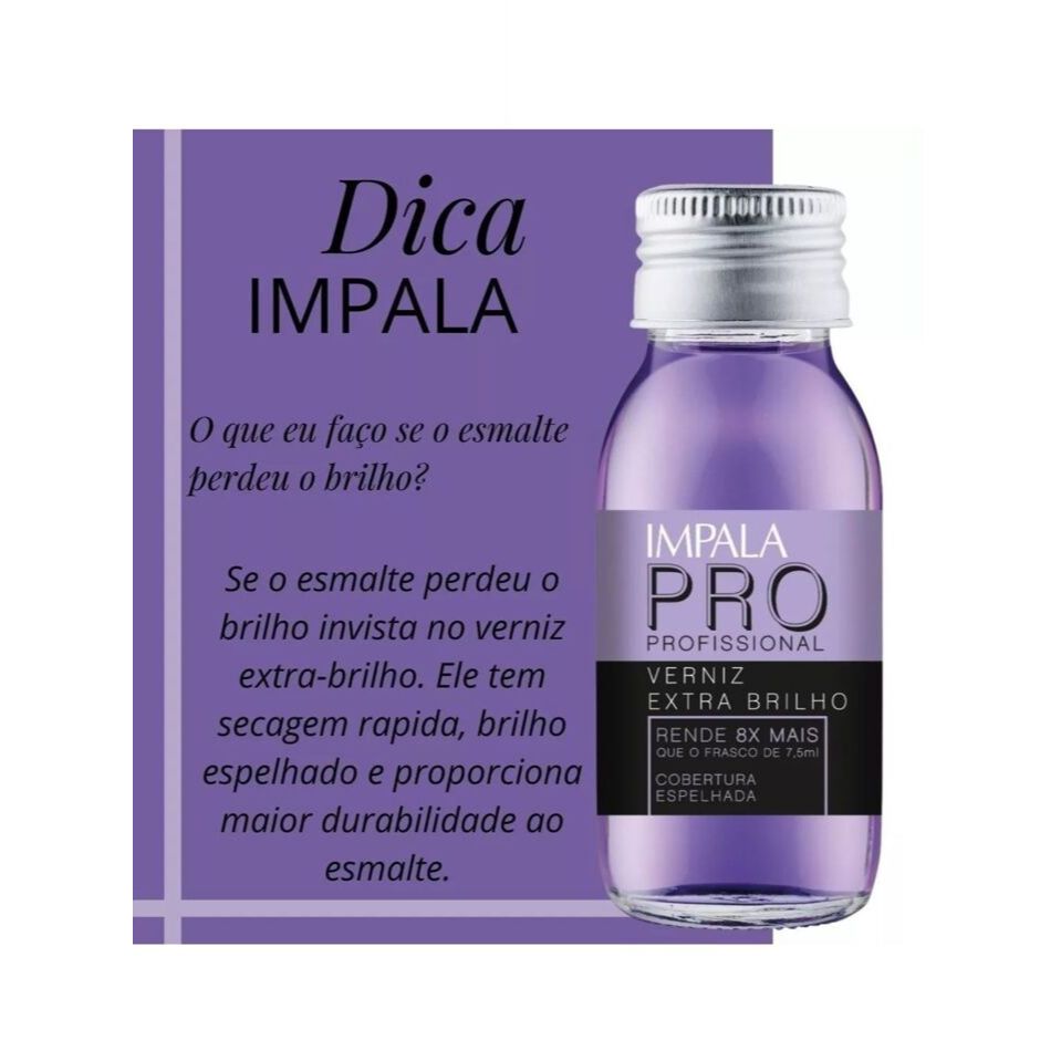 A Impala, empresa reconhecida pela qualidade dos seus produtos e da valorização autoestima feminina, apresenta sua coleção de esmaltes para uso Profissional com excelência. Experimente IMPALA e Surpreenda-se com os resultados. Cobertura que intensifica o brilho, efeito espelhado, proporciona maior durabilidade aos esmaltes e tem secagem ultrarrápida. Rende 8x mais que a embalagem de 7,5ml. Promete qualidade com custo X benefício.