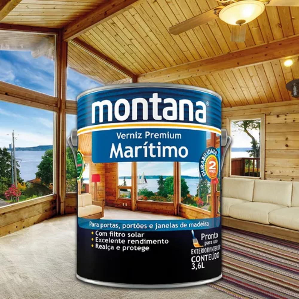 VERNIZ MARITIMO NATURAL 3,6L MONTANA Proteja superfícies de madeira em contato constante com umidade e maresia com o Verniz Premium Marítimo, que oferece filtro solar. BENEFÍCIOS: - Fácil aplicação; - Ótimo rendimento; - Secagem rápida; - Ótimo alastramento; - Proteção contra os raios ultravioleta; - Resistência ao atrito e dureza; - Excelente durabilidade; - Resistência às intempéries, à maresia e à água. O QUE É E COMO FUNCIONA? O Verniz Premium Marítimo é um verniz transparente, feito com resina à base de poliuretano modificada e filtro solar. Após a secagem, forma uma película que protege, realça os veios, embeleza e enobrece a madeira. INDICAÇÕES: A aplicação do Verniz Premium Marítimo é indicada para superfícies de madeira (aplainadas, lixadas ou rústicas) em contato com a água ou maresia, utilizadas em portas, portões, janelas, beirais, forros, estruturas de telhado, decks, terraços e móveis externos. SECAGEM: - Entre demãos: 12 horas - Manuseio: 12 horas - Final: 24 horas RENDIMENTO: - Até 23 m² / 3,6 L / acabado MODO DE USO: Antes da aplicação do Verniz Premium Marítimo é necessário que a peça ou superfície a ser envernizada esteja limpa e seca, livre de partículas soltas, mofo e isenta de óleos, graxas, ceras e outros contaminantes. Não aplicar em madeiras verdes ou úmidas Para madeiras novas: Lixe a madeira na direção dos veios, elimine a poeira do lixamento e faça a aplicação do verniz seguindo as orientações da embalagem. Para Madeiras envelhecidas (acinzentadas): Em madeiras envelhecidas sem nenhum tipo de acabamento, aplique o tratamento necessário para restaurar a tonalidade e textura natural da superfície. Em seguida, prossiga como madeira nova para fazer a aplicação do verniz. Para madeiras envernizadas ou com stain: Para peças em boas condições, efetue o lixamento com uma lixa de grana fina e aplique o Verniz Premium Marítimo. Para superfícies em más condições, remova completamente o acabamento anterior utilizando o Striptizi Gel da Montana. Em seguida, elimine os resíduos do removedor e proceda como madeira nova. Para madeiras resinosas: Para madeiras resinosas (Cumuru, Ipê, Peroba, Angelim, Itaúba, Jatobá, Maçaranduba, entre outras) em ambientes internos, lixe a madeira na direção dos veios e aplique duas demãos de Isolare base solvente. O objetivo é impedir a exsudação (migração) dos extrativos da madeira resinosa e o retardamento da secagem do verniz. Para uso externo, aplique o verniz diretamente sobre a madeira. Para aplicação com trincha ou rolo o verniz já vem pronto para uso.
