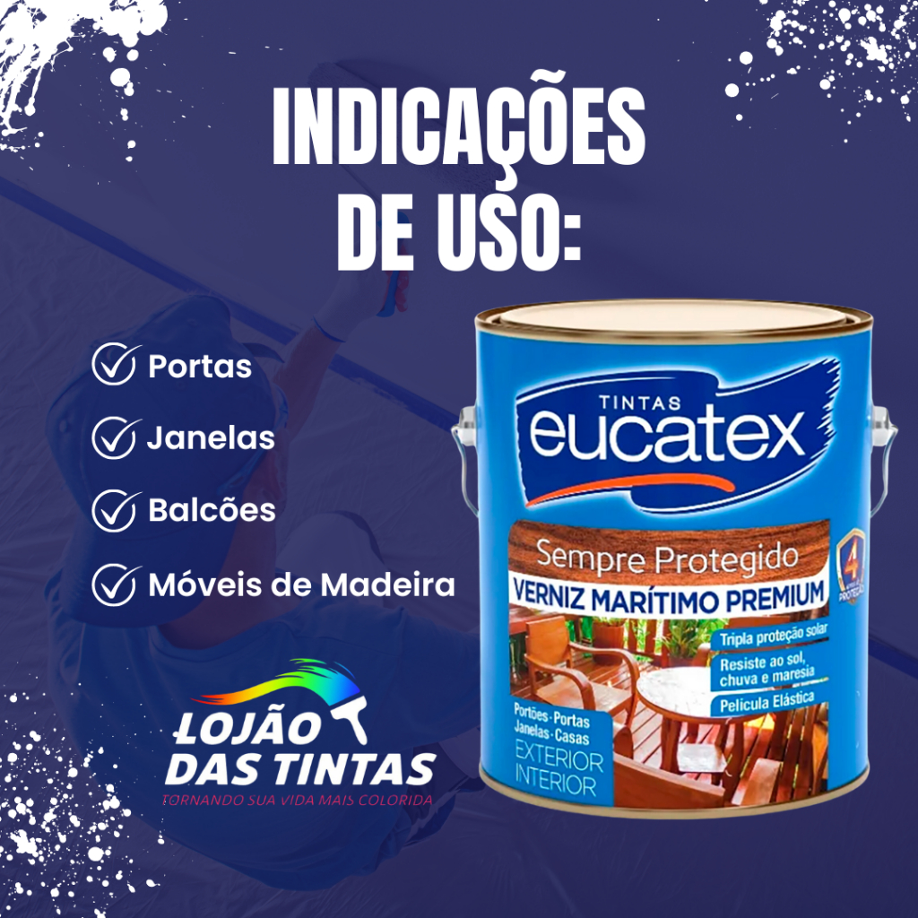 Verniz Marítimo Eucatex – Proteção e Brilho Duradouro para Madeiras Internas e Externas Proteja e realce a beleza natural da madeira com o Verniz Marítimo Eucatex, desenvolvido especialmente para resistir às mais diversas condições climáticas. Ideal para áreas internas e externas, ele forma uma película protetora flexível que acompanha os movimentos naturais da madeira, evitando rachaduras, descascamentos e o desgaste provocado pelo sol e pela chuva. Com acabamento brilhante e alta durabilidade, o Verniz Marítimo Eucatex realça os veios da madeira, garantindo um visual sofisticado e resistente por muito mais tempo. Indicado para uso em: ✔ Portas e janelas de madeira ✔ Pergolados e cercas ✔ Móveis de jardim ✔ Forros, venezianas e lambris ✔ Estruturas de madeira expostas ao sol e à umidade Importante: não indicado para pisos ou superfícies que recebam atrito constante. Informações Técnicas: 📦 Rendimento Aproximado • Lata 900ml: até 16 m² por demão • Galão 3,6L: até 64 m² por demão ⏱ Tempo de Secagem • Ao toque: 2 horas • Entre demãos: 12 horas • Cura total: 72 horas 💧 Diluição Recomendada • Primeira demão: até 10% de aguarrás • Demãos seguintes: produto puro 🎨 Aplicação • De 2 a 3 demãos, com intervalo de 12 horas entre cada uma • Aplicar com pincel, rolo ou pistola sobre madeira limpa, seca e lixada ⚠ Atenção A durabilidade do verniz depende da correta preparação e manutenção da superfície. A garantia cobre apenas eventuais defeitos de fabricação, não incluindo falhas por uso inadequado.