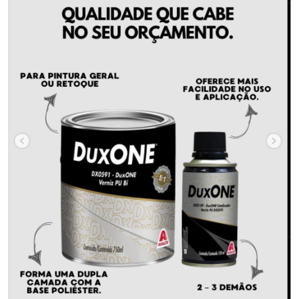 Descrição: Verniz bicomponente à base de resina acrílica reticulada com isocianato alifático. Indicado para pintura geral ou retoque, formando um sistema de dupla camada com Duxone Base Poliéster. Relação Mistura: Para 5 partes de DX0591 adicionar 1 parte de catalisador DX0159. Ajuste Aplicação : Pistola Convencional: - Bico: 1.4 mm - Pressão: 40 – 50 lbf/in2 / Pistola HVLP: - Bico: 1.4 – 1.6 mm - Pressão: 6 – 8 lbf/in2 Aplicação: Aplicar 2 – 3 demãos. Intervalo Demãos: Aguardar 5 a 10 minutos entre demãos. Secagem: Ao Ar: - Toque: 30 minutos - Polimento: 16 horas / Estufa: - Flash-off: 30 minutos - Ciclo: 30 minutos @ 600C Rendimento : 7 m2 /litros para 3 demãos. VERNIZ PU BI 0591 + END 0159 0,9L DUXONE