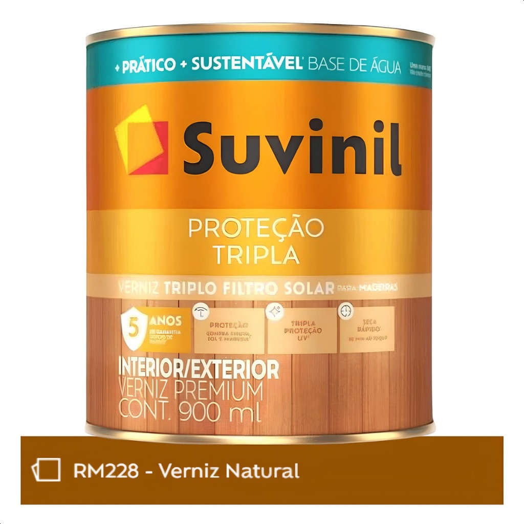 VERNIZ BASE DE ÁGUA SUVINIL 900ML CORES: IMBUIA, NATURAL E MOGNO ACABAMENTO: BRILHANTE Que tal investir em um produto eficiente e sustentável para revitalizar as madeiras da sua casa? Aposte no verniz à base de água Suvinil Proteção Tripla! Nas cores Imbuia, Mogno e Natural, é uma escolha perfeita para quem busca qualidade e durabilidade. Este verniz é da marca Suvinil, conhecida pela excelência de seus produtos e pela confiança que inspira em seus consumidores. Com um tempo de secagem de apenas 30 minutos, este verniz é ideal para quem busca resultados rápidos sem comprometer a qualidade do acabamento. A linha SECARAPIDO da Suvinil foi desenvolvida pensando na praticidade e na eficiência, tornando o trabalho de pintura mais fácil e rápido. Benefícios: Seca Rápido: 30 minutos ao toque Tripla Proteção UV Proteção contra sol, chuva e maresia Informações técnicas: 2 a 3 demãos Diluição com 20% de água potável Rendimento: 22m² acabados Secagem: Ao toque 30 minutos / Entre demãos 4 horas / Final 5 horas