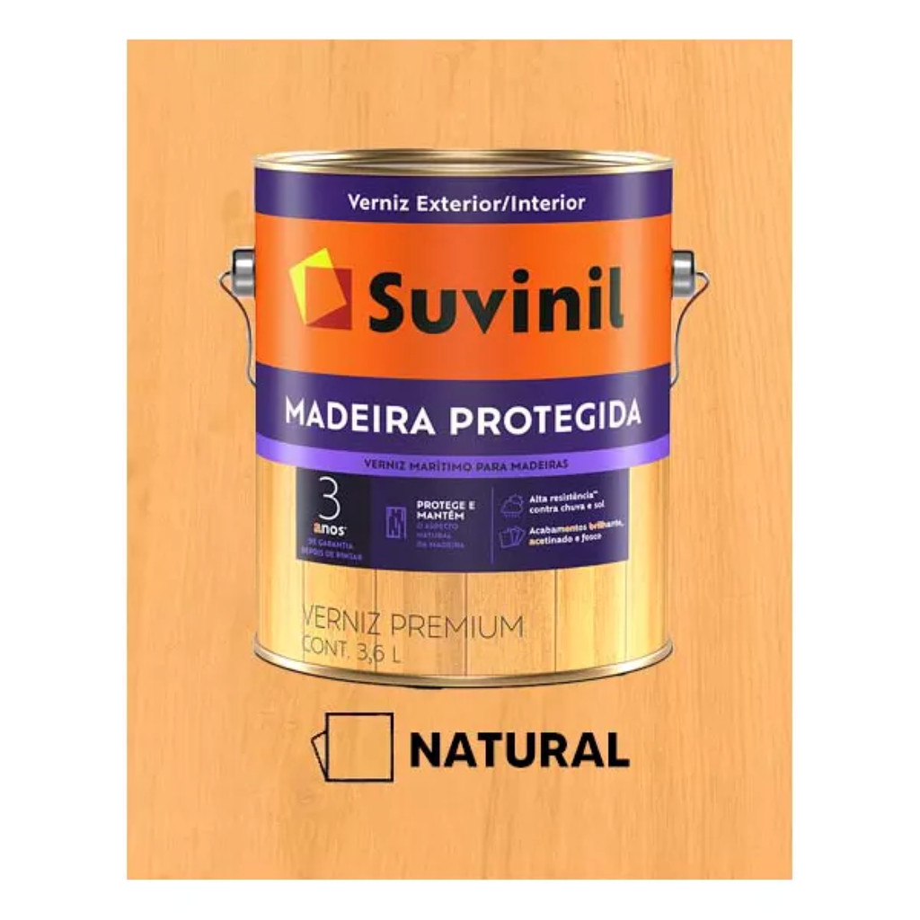 CONHEÇA O VERNIZ SUVINIL MADEIRA PROTEGIDA BRILHANTE O Verniz Suvinil Madeira Protegida Brilhante é ideal para impedir que superfícies desse material sejam danificadas por chuva e sol. Se for aplicado corretamente, o produto mantém o local seguro de intempéries por até três anos. RENOVA A MADEIRA O verniz marítimo natural da Suvinil é perfeito para quem deseja recuperar e valorizar as superfícies de madeira desgastadas com o tempo. Isso só é possível porque esse produto possui um efeito que realça e proporciona o aspecto natural do material. ALTO RENDIMENTO O Verniz Suvinil Madeira Protegida Brilhante está disponível em dois tamanhos em nosso site: 900 ml e 3,6 L. Com essas quantidades, é possível cobrir superfícies de 4,2 m² a 17 m². SECAGEM RÁPIDA Outro ponto alto do verniz de madeira da Suvinil é o tempo rápido de secagem. Isso permite que a área seja usada pouco depois da aplicação do produto. Para o item ficar seco ao toque, é preciso esperar de 4 a 6 horas. Entre as demãos, o tempo aguardado é de 12 horas. Já para o resultado completo, 24 h. COMPOSIÇÃO Na Suvinil, você só encontra produtos produzidos com as melhores matérias-primas. Por isso, no verniz marítimo brilhante da marca, há substâncias como resina alquídica, xileno, aguarrás, base de óleo vegetal semissecante, entre outras que garantem a qualidade do item. COMO APLICAR O VERNIZ SUVINIL MADEIRA PROTEGIDA BRILHANTE Para aplicar o verniz brilhante da Suvinil, é necessário diluir o item com 10% de aguarrás. Seja para madeira nova, seja para repintura, a quantidade de diluição do solvente é a mesma. Antes de colocar a substância, abra a lata e misture bem o produto com a ajuda de uma espátula. A aplicação deve ser feita com pincel, rolo de espuma ou pistola. No último caso, é necessário diluir com 20% de aguarrás para pressão entre 30 e 35Ibs/pol² ou 2,2 e 2,8 kgf/cm². Caso seja necessário, coe o item antes de aplicar. Já em relação às demãos, é preciso aplicar três em caso de maneiras novas e de uma a duas se o material for repintado. Lembre-se de deslizar o verniz com pinceladas compridas. Se o pincel repuxar, dilua a sustância com mais um pouco de solvente. VERNIZ MADEIRA PROTEGIDA BRILHANTE NATURAL SUVINIL 900ML