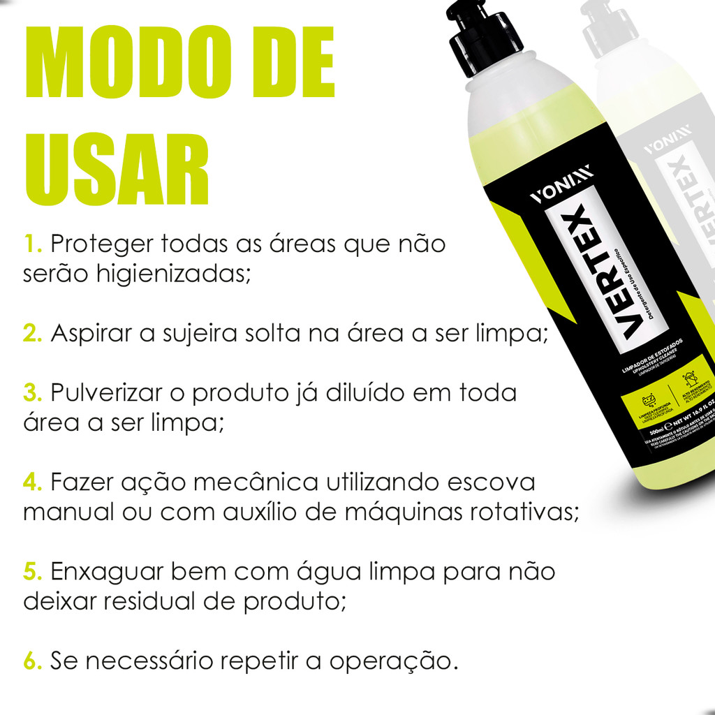 >>>>>>LIMPADOR DE ESTOFADOS VERTEX 500ML VONIXX<<<<<< Conteúdo da Embalagem: 01 (Um) Limpador de Estofados; Vertex 500ml Vonixx; **Imagens e vídeo do anúncio são reais. Vertex é um limpador de estofados automotivos e residenciais. O produto tem alta concentração de ativos a fim de aumentar o rendimento e limpar com eficiência. CARACTERÍSTICAS: - Indicado para estofados de automóveis e residências - Limpeza profunda - Fácil aplicação em uma etapa - Formulação que remove sujeiras e manchas difíceis Observações importantes: Em caso de contato com cerâmica ou porcelanato, recomendamos enxaguar imediatamente para evitar possíveis manchas. O produto é alcalino e recomendamos o uso de óculos e luvas. Não recomendado para tecidos naturais como linho, seda, lã e demais tecidos naturais, pois poderá causar manchas. Em caso de limpeza de estofados automotivo, evitar respingar o produto em outras superfícies do veículo, tais como: couro, vidros, plásticos e demais superfícies internas do carro a fim de evitar manchas. LIMPADOR DE ESTOFADOS LIMPEZA PROFUNDA ALTO RENDIMENTO MODO DE USO: 1. Proteger todas as áreas que não serão higienizadas. 2. Aspirar a sujeira solta na área a ser limpa. 3. Pulverizar o produto já diluído em toda área a ser limpa. 4. Fazer ação mecânica utilizando escova manual ou com auxílio de máquinas rotativas. 5. Enxaguar bem com água limpa para não deixar residual de produto. 6. Se necessário repetir a operação.