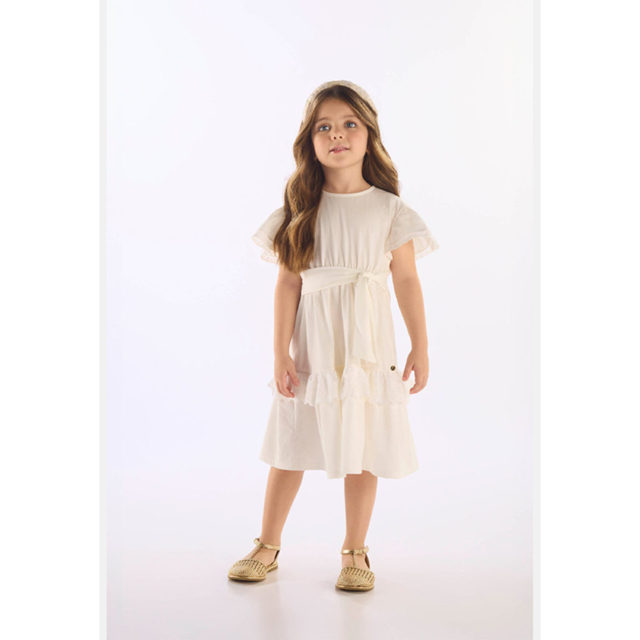 Vestido infantil confeccionado em algodão leve e respirável, garantindo conforto e bem-estar. Apresenta mangas amplas com babados delicados, elástico e faixa na cintura que valorizam o caimento, além de costura reforçada e plaquinha personalizada discreta. Um modelo versátil e elegante, perfeito para momentos especiais.Tecido: Vestido: Meia Malha (Algodão)Composição: 100%algodãoModelagem: AmplaComprimento Mangas: CurtaComprimento: CurtoForro: NãoCintura: MédiaDecote/Gola: Redondo
