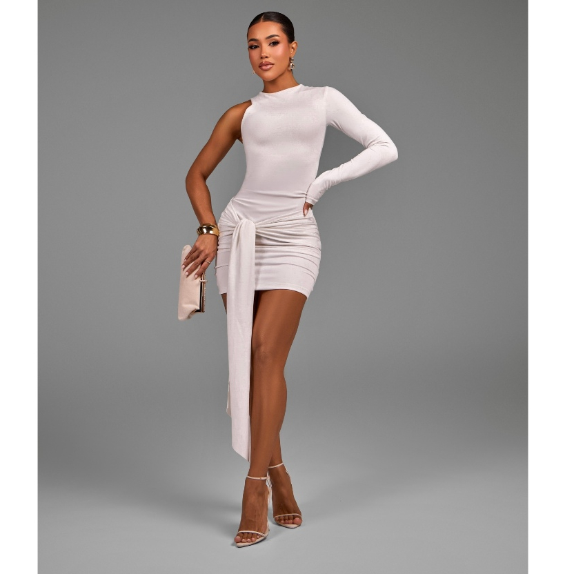 Vestido Arman curto assimétrico manga longa mula manca com detalhe de nó babado na saia moda feminina tecido suplex