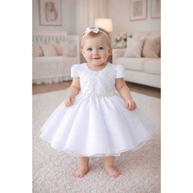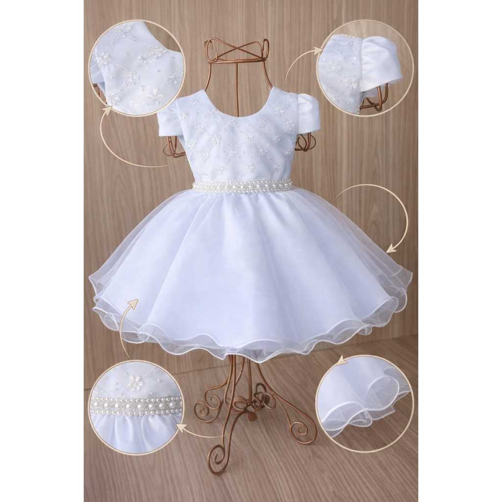 Vestido bebê branco batizado daminha festa aniversário cinto perolas