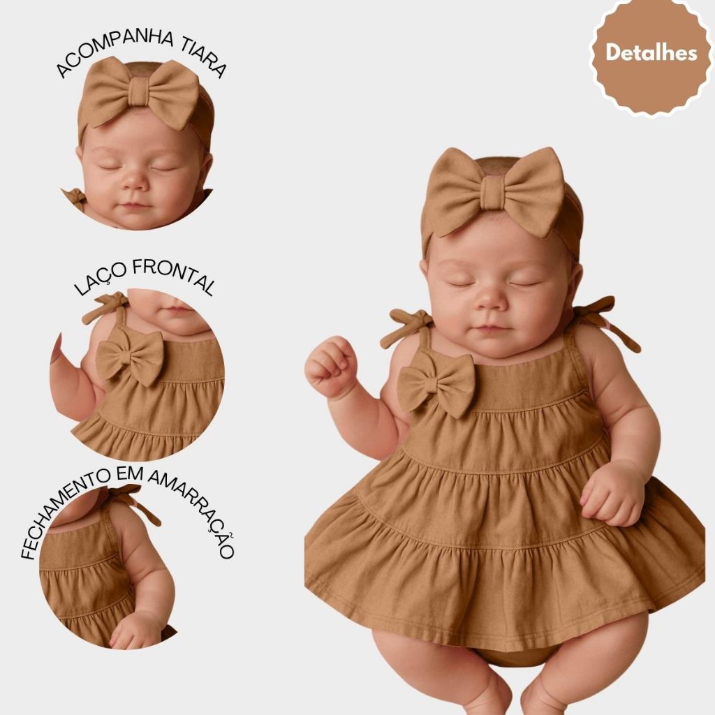 Um vestidinho leve com modelagem rodada e camadas franzidas, e uma faixa de cabelo com laço combinando. A peça principal possui alcinhas amarráveis e um laço decorativo no busto, trazendo delicadeza e charme. O tecido leve e macio é ideal para momentos especiais, ensaios fotográficos, festas e passeios em família. sensação de conforto, enquanto a composição transmite um visual fofo, harmonioso e adorável, perfeito para capturar memórias inesquecíveis. -> OBS: Informamos que as imagens possuem caráter meramente ilustrativo. A representação mais fiel do produto está na foto sem o uso de modelos/crianças, correspondendo com maior precisão às características reais da peça. > Tabela de Medidas Tamanho RN 3 meses Busto: 46 cm Cintura: 56 cm Comprimento: 28 cm Tamanho P 3-6 meses Busto: 50 cm Cintura: 60 cm Comprimento: 30 cm Tamanho M 6-12 meses Busto: 52 cm Cintura: 62 cm Comprimento: 37 cm Tamanho G 12-24 meses Busto: 54 cm Cintura: 64 cm Comprimento: 38 cm Use uma fita métrica para comparar com as medidas da criança e garantir o tamanho ideal. As medidas referem-se à peça fora do corpo e podem apresentar variações de até 1 cm para mais ou menos. Ideal para proporcionar conforto e caimento perfeito! Pensado com carinho para vestir com conforto e charme, este modelinho acompanha sua bebê nos primeiros momentos com um caimento encantador.