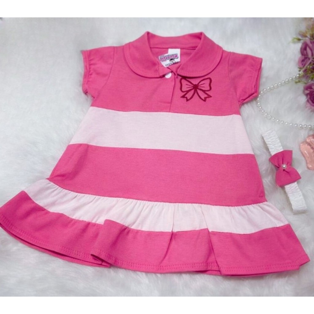 Vestido Bebê Menina RN a 6 Meses Listrado com Bordado + Tiara Conjunto Infantil