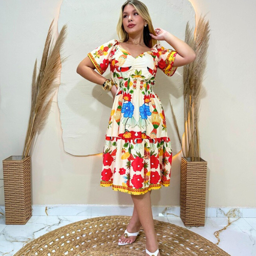 Vestido Casual Estampado com Flores em Estilo A-Line Feminino, Verão