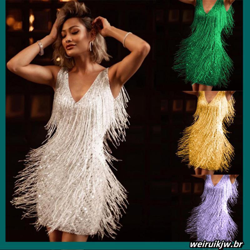 Vestido Com Decote Em V Sexy Saia Lápis Sem Mangas Média Franjas