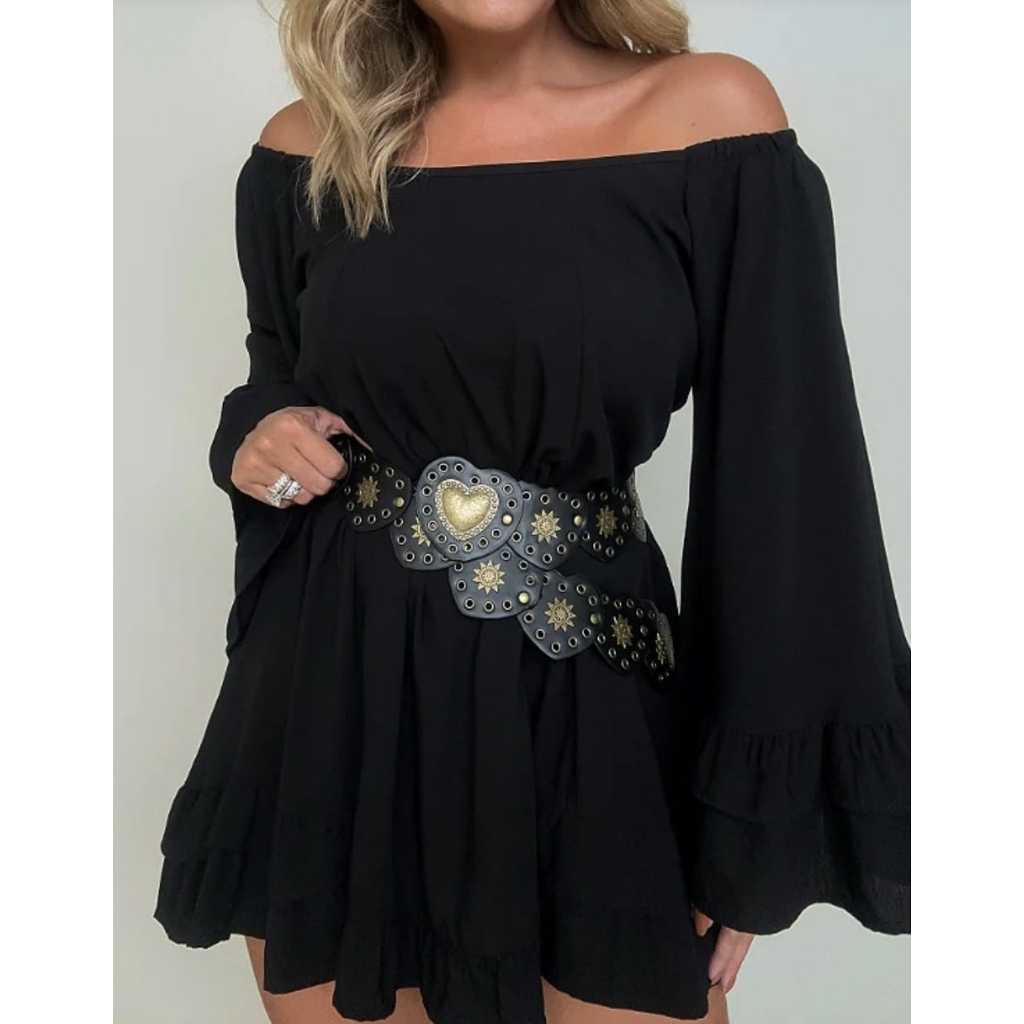 Vestido Curto Boho Fresco Ombro a Ombro Babado Manga Flare Viscolinho Verão Vânia