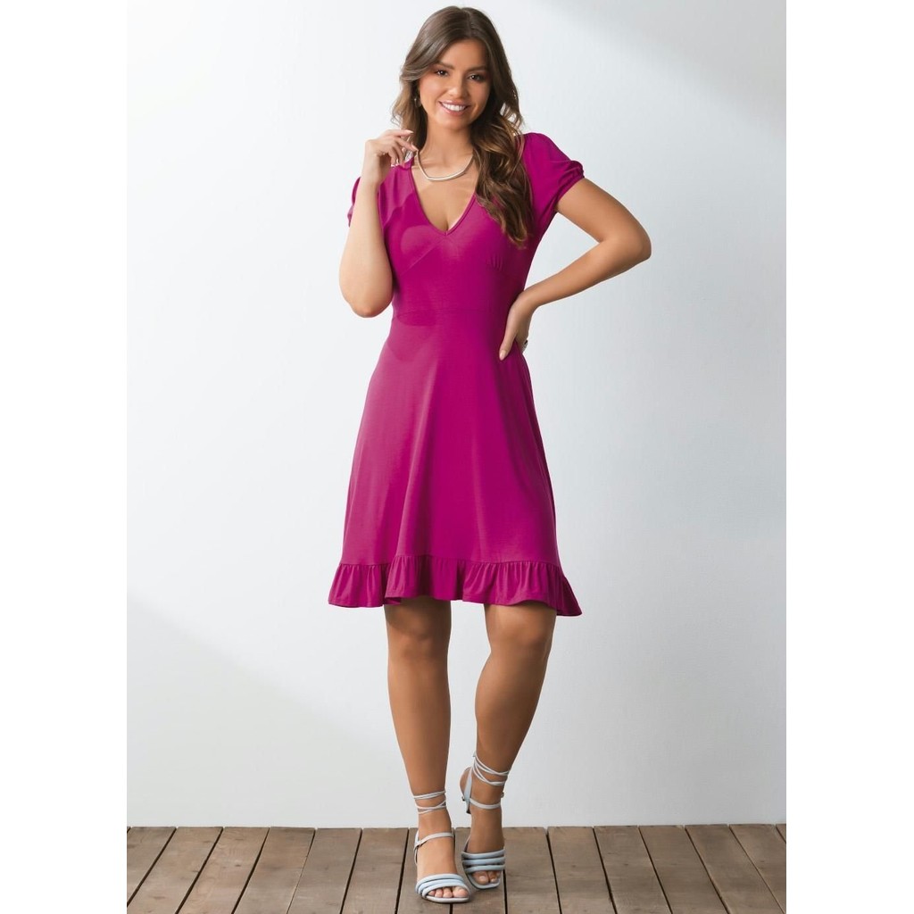 Vestido em malha de viscose com elastano. Decote v, mangas curtas levemente bufantes, recorte anatômico na cintura e busto, babado na barra. Comprimento curto. Garantia: • 7 dias de garantia