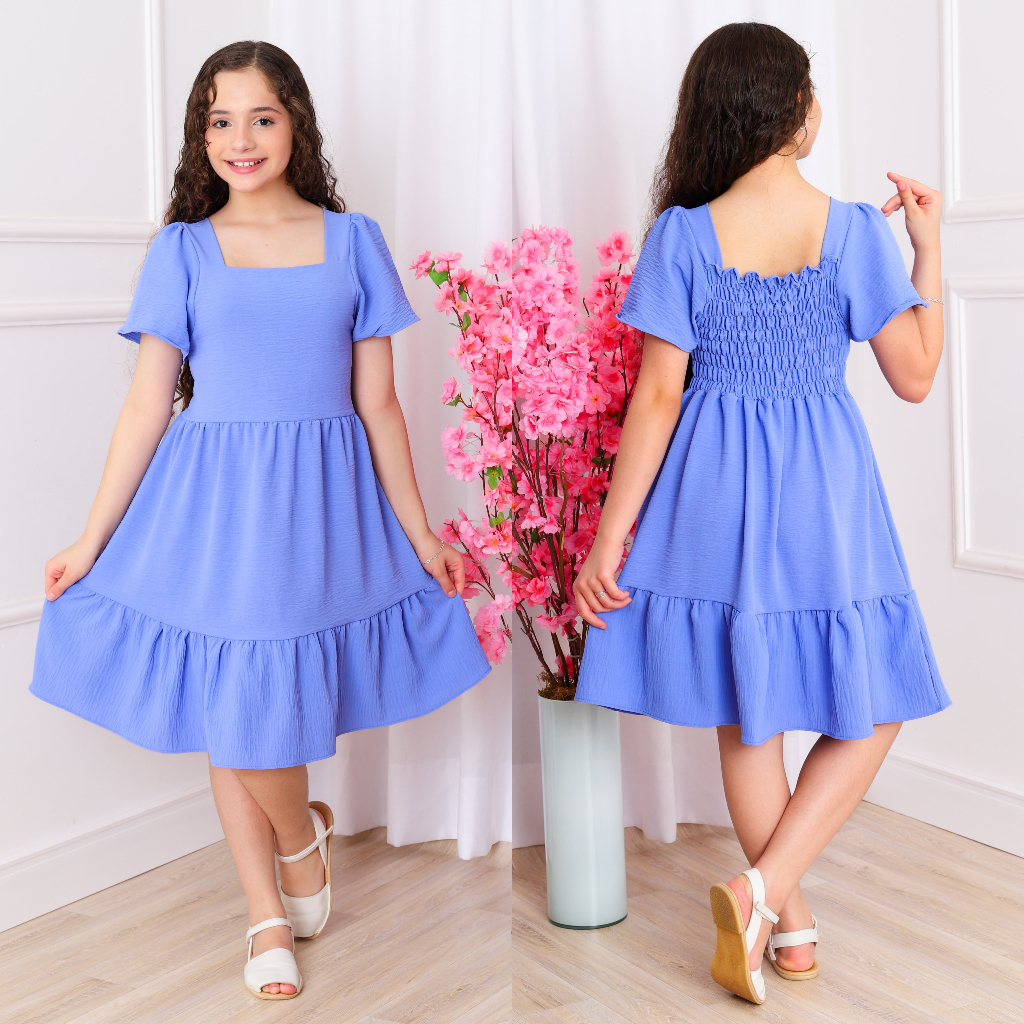 VESTIDO CURTO DE MANGA CURTA EM TECIDO DUNA E um vestido curto leve e bem levinho feito no tecido duna Que e macio soltinho e tem um aimento super confortavel AS manquinhas sao curtas e fofinhas com um toque delicado A parte de cima e mais ajustadinha com um decote cuadradinho Que deixa o visual bem elegante NAS costas e elastico FICa perfeito para festinha natal fotos e momentos especias