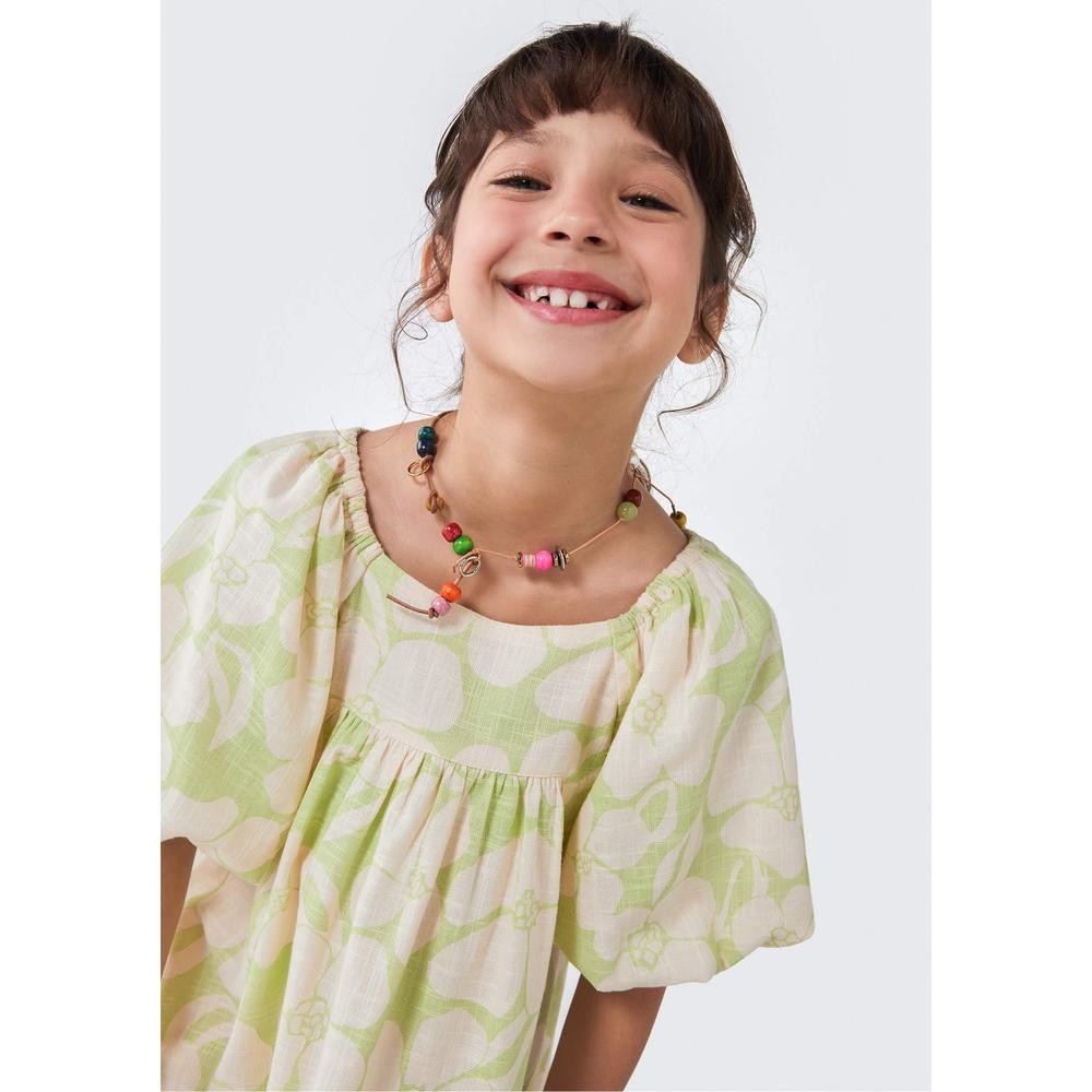 Vestido de modelagem solta ao corpo com comprimento acima do joelho, decote reto, manga balonê com elástico aplicado e recorte com franzido. Peça em tecido plano com estampa corrida.