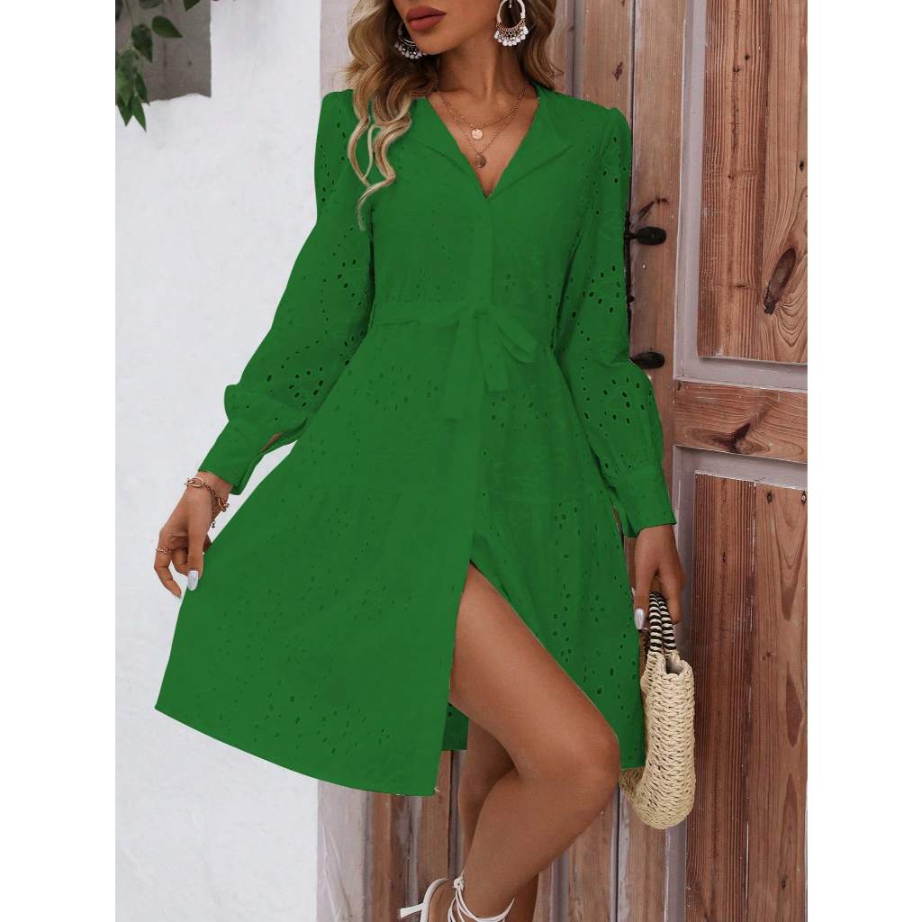 Vestido lese algodão curto manga longa forrado com elástico na cintura. Modelo possui botões funcionais e acompanha um cinto de tecido para laço removível. P(36)/ M(38)/ G(40)/ GG(42)