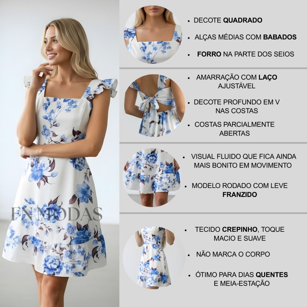 🌸 Vestido Feminino Curto Rodado com Costas Abertas e Amarração Ajustável O vestido que transforma qualquer produção em um look marcante e feminino ✨ Com modelagem rodadinha que valoriza a cintura e cria movimento leve ao caminhar, ele une conforto, delicadeza e aquele toque romântico que está super em alta. O grande destaque fica nas costas abertas com laço ajustável, trazendo charme e sensualidade na medida certa. O decote quadrado deixa o visual moderno e elegante, perfeito para quem ama estar estilosa sem abrir mão do conforto. 💖 Modelagem soltinha que se adapta ao corpo 💖 Amarração ajustável (melhor encaixe na cintura) 💖 Tecido leve e confortável (Tecido Crepinho) 💖 Ideal para verão, passeio, festa, jantar, look casual chic 💖 Perfeito para fotos, eventos e look Elegante Combina com sandália, salto, rasteirinha ou até tênis para um visual fashionista. Uma peça versátil que vai do dia ao evento especial com facilidade. 🔥 Tendência forte na moda feminina 🔥 Modelo que valoriza a silhueta 🔥 Disponível em várias estampas 📌DETALHES • Não é transparente (possui forro na parte do busto) • FORRO: Forrado na região dos seios • BOJO: ❌ Não possui bojo • Ajuste nas costas: Amarração em laço para melhor adaptação ao corpo Garanta o seu antes que acabe, modelos com costas abertas são os mais procurados da temporada! Promoção Oferta Relâmpago