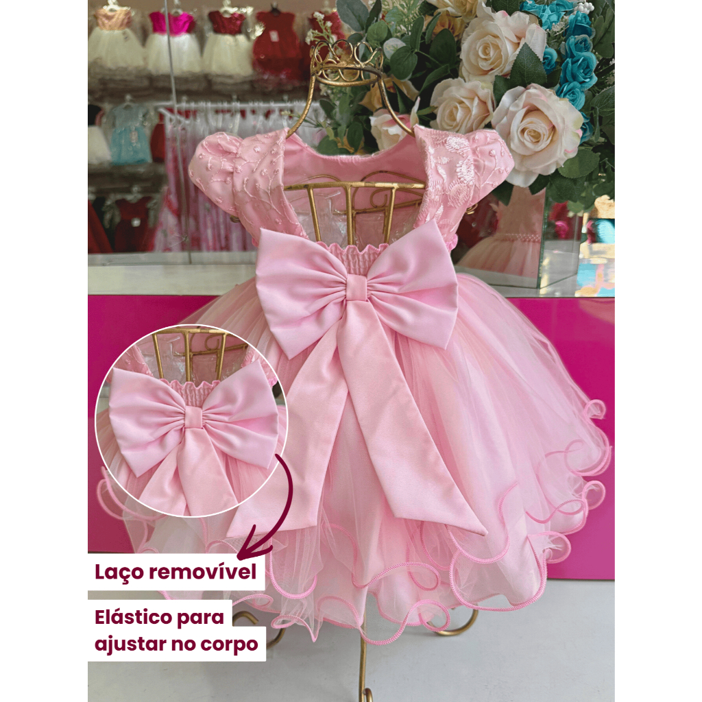 Deixe sua princesa ainda mais encantadora com este lindo vestido infantil de luxo! Feito com materiais de alta qualidade, ele é ideal para ocasiões especiais como aniversários, casamentos e batizados. ✨ Destaques do Produto: ✔️ Disponível em várias cores: Rosa bebê, Branco, Rosê e Off White ✔️ Parte superior bordada com aplicação de flores em relevo ✔️ Manga curta com detalhes delicados ✔️ Cintura adornada com pérolas para um toque sofisticado ✔️ Saia rodada em camadas de tule. Para um efeito volumoso e elegante utilizar nosso saiote vendido separadamente. ✔️ Acabamento com barrado ondulado para um charme extra Disponível em diversos tamanhos! ✨ Sua pequena irá brilhar com um vestido digno de conto de fadas! ➡️ Tabela de medidas está no final das fotos! ➡️ Enviamos no próximo dia útil da compra! Perguntas Frequentes – Leia Antes da Compra O vestido acompanha saiote? Nosso saiote é vendido separadamente, o vestido possui voal duplo e tule mas para que fique volumoso como na foto é necessário o uso do saiote. O laço é removível? Sim, nesse modelo é possível remover o laço e utilizar o vestido sem laço. O cinto é removível? Não, o cinto desse modelo não é removível. É possível remover as borboletas ou cinto? Não recomendamos a remoção pois pode danificar o tecido impossibilitando recolocar o aplique de borboletas e o cinto.