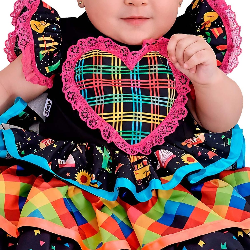 Itens inclusos: 01 Vestido junino bebê Dimensões do produto: Tamanho: P - Veste Numeração de roupa 0 a 3 meses. M - Veste Numeração de roupa 3 a 6 meses. G - Veste Numeração de roupa 6 a 9 meses GG - Veste Numeração de roupa 9 a 12 meses Ficou na dúvida de qual tamanho escolher ? Sempre indicamos a escolha de um tamanho maior pois é mais fácil fazer um ajuste, caso necessário. E por ser para criança, a fantasia irá durar por mais tempo conforme ela for crescendo. Especificações Técnicas Material: 100% Poliéster Cor: Preto. Produto a pronta entrega! Produto original! Sua bebê vai entrar no clima da Festa Junina com muito estilo usando o Vestidinho de Caipirinha Balão Encantado! Feito especialmente para bebês fofos, ele é confeccionado com tecido leve e confortável. O vestido é cheio de detalhes bordados nas mangas e saia, no corpinho tem um lindo coração bordado com detalhes xadrez. A saia é um destaque à parte, com quatro camadas e acabamento em passamanaria de pompom, que deixa tudo ainda mais bonito e divertido. Ideal para curtir festas como São João, Arraial ou qualquer evento junino com muita animação, charme e aquele toque especial de tradição. Saia Rodada Saia 4 Babados Cintura com elástico Não Esquenta Não Pinica Confortável