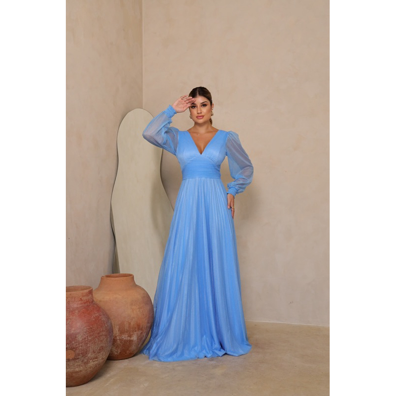 vestido de festa longo feminino decote e saia plissado MANGA ELASTEX