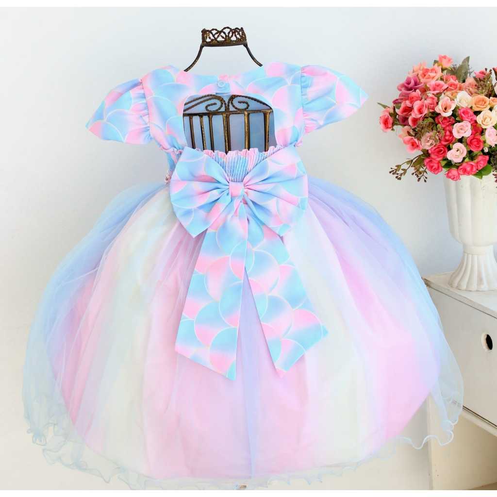 Vestido de Festa Luxo Colorido Tematico Fundo do Mar com Tiara.