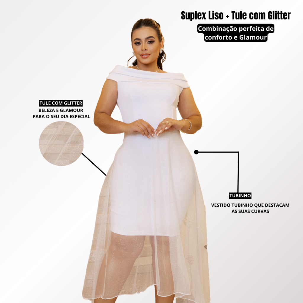 Vestido MIDI Tubinho Glitter Tule de Noiva - Tecido de Crepe (Malha fresquinha & Toque macio) / Tule Poliéster - Não Amassa - Excelente Costura e Acabamento - Costura Reforçada - Tamanho: P: 38/40 M:40/42 G:42/44 GG:44/46 - Não possui bojo Medidas do Tule Tamanho P: Costas 95cm - Frente 68cm - Forro 56cm. (São apenas 1cm de diferença de um tamanho para o outro.) O vestido segue uma modelagem ajustada ao corpo, no estilo tubinho, que realça a silhueta de forma delicada e elegante. O comprimento midi oferece um toque clássico, ideal para ocasiões formais como casamentos civis. O decote ombro a ombro destaca os ombros e o colo de forma sutil e feminina, proporcionando um ar romântico e contemporâneo. Esse tipo de decote é perfeito para noivas que desejam um look elegante sem abrir mão de um toque moderno. A aplicação de tule com glitter adiciona um brilho sutil e sofisticado ao vestido, criando um efeito delicado e encantador. Este vestido é a escolha perfeita para noivas que desejam um look minimalista, porém impactante, com detalhes que destacam a sofisticação e o brilho suave, ideal para um casamento civil.