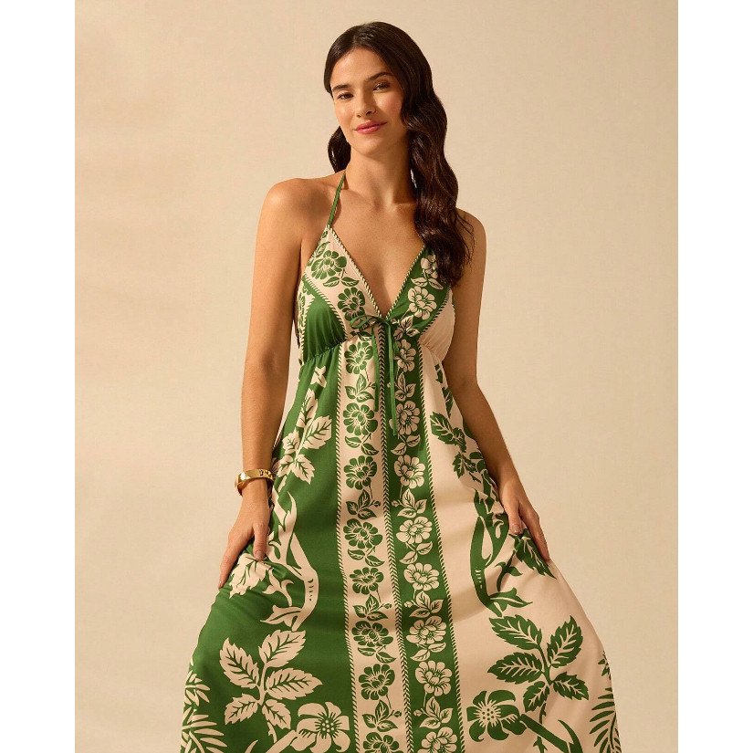 Vestido longo casual com estampa tropical e gola frente-única, perfeito para um look boho descontraído. O detalhe das costas nuas com nó e a linha de cintura alta complementam o estilo, enquanto a estampa de plantas traz um toque de frescor e natureza. Material • 95% Poliéster, 5% Elastano Características: Tecido: Não elástico, não transparente Caimento: Ajuste regular Comprimento: Longo Comprimento da manga: Sem mangas Instruções de manutenção: Lavar à máquina Usar detergente suave