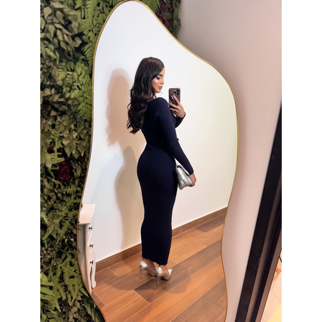 Vestido Decote Coração Max Mídi Longuete Canelado Tricot Inverno