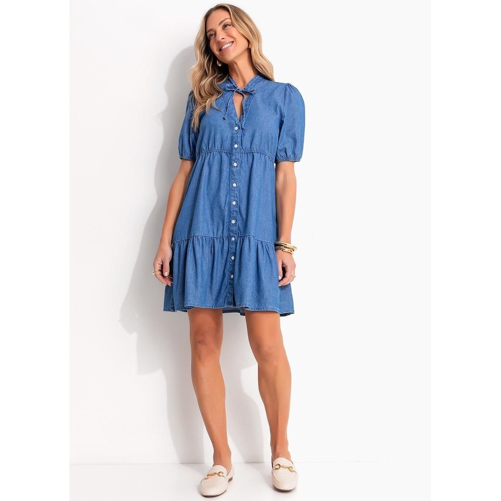 Vestido jeans médio, decote frente com gola padre, comprimento da manga curta, complementos elástico nos punhos, ombro com detalhe franzido, detalhe para amarrar, comprimento clássico, material jeans. Tabela de Medidas: P (36 até 38): Busto: 80 até 88 cm | Cintura: 64 até 72 cm | Quadril: 88 até 96 cm M (40 até 42): Busto: 88 até 96 cm | Cintura: 72 até 80 cm | Quadril: 96 até 104 cm G (44 até 46): Busto: 96 até 100 cm | Cintura: 80 até 88 cm | Quadril: 104 até 112 cm GG (48 até 50): Busto: 104 até 116 cm | Cintura: 88 até 100 cm | Quadril: 112 até 124 cm XXG (52 até 54): Busto: 116 até 128 cm | Cintura: 100 até 112 cm | Quadril: 124 até 136 cm XLG (56 até 58): Busto: 128 até 140 cm | Cintura: 112 até 124 cm | Quadril: 136 até 148 cm. Este produto é destinado apenas para consumidores finais (CPF). Não realizamos a venda para CNPJ.