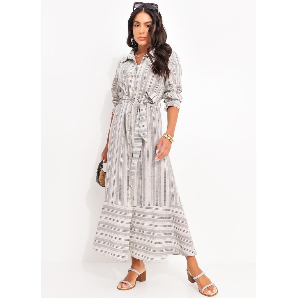 Vestido natural, modelagem solta, decote frente com gola, manga longa com punho e abertura de botão, comprimento alongado, faixa no mesmo tecido para amarração, material linho fio tinto. Este produto é destinado apenas para consumidores finais (CPF). Não realizamos a venda para CNPJ.