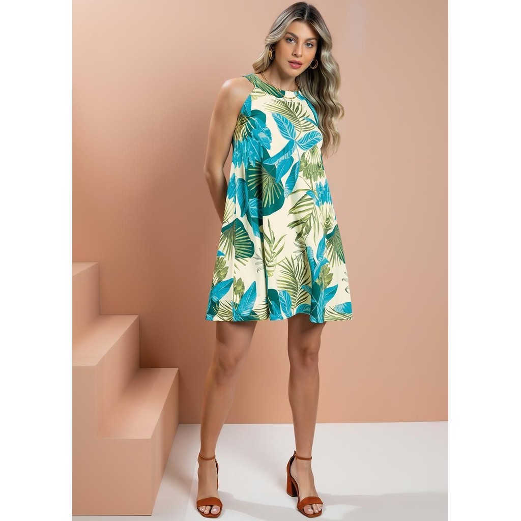 Vestido folhagem bege, modelagem solta, modelo evasê, decote frente halter, comprimento curto, material malha fria.