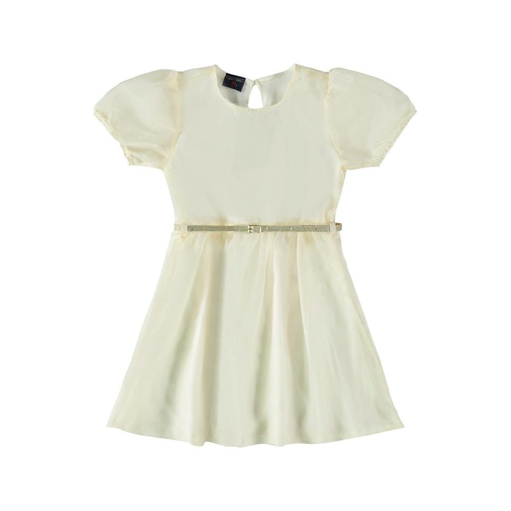 Vestido infantil confeccionado em tecido organza com muito brilho, mangas curtas bufantes e gota com fechamento por botão nas costas. O vestido conta com forro em meia malha e acompanha um lindo cinto dourado.Tecido: Vestido: OrganzaComposição: 100% poliéster / Forro: 100% algodãoModelagem: JustaComprimento Manga: CurtaComprimento: CurtoForro: SimDecote/Gola: Redondo