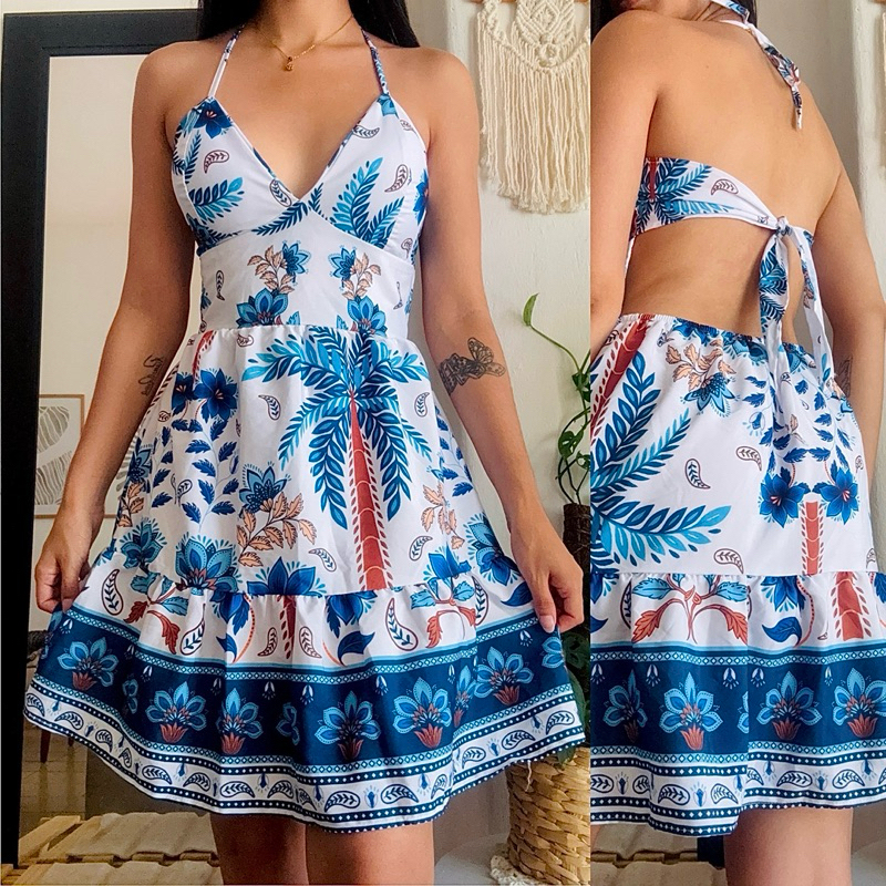 Vestido Estampado Costas Abertas Decotado Flores Moda Feminino Verão 2026 Praia Tropical Carnaval