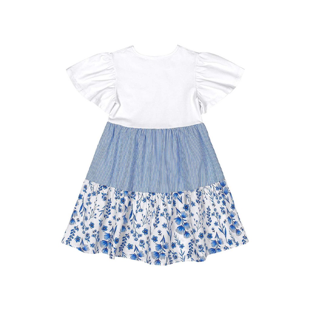 Com um estilo romântico e cheio de alegria, este vestido encanta pela combinação de cores e tecidos. A parte superior em cotton branco oferece conforto e delicadeza, enquanto o recorte central em tricoline listrado adiciona um toque moderno ao visual. A saia com estampa floral azul completa a peça com charme e leveza. Os detalhes franzidos e a plaquinha dourada na barra finalizam o look com sofisticação.Tecido: Cotton e tricolineComposição: Blusa: 96% Algodão e 4% Elastano e 100% AlgodãoModelagem: JustaComprimento Mangas: CurtaComprimento: CurtoForro: NãoDecote/Gola: RedondoInformações Extras: Possui recortes com estampas diferentes