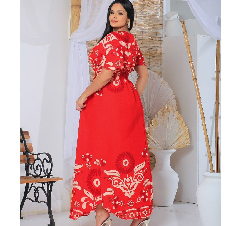 VESTIDO FEMENINO LONGO GOLA V MANGA FLUIDA TAMANHO G1 TECIDO DUNA