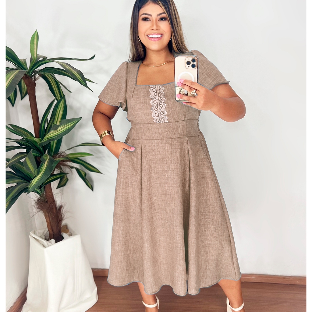 Vestido Feminina Midi, Renda,Manga Curta, Bolsos Laterais Duna Premium, Lastex ,luxo, Forrado