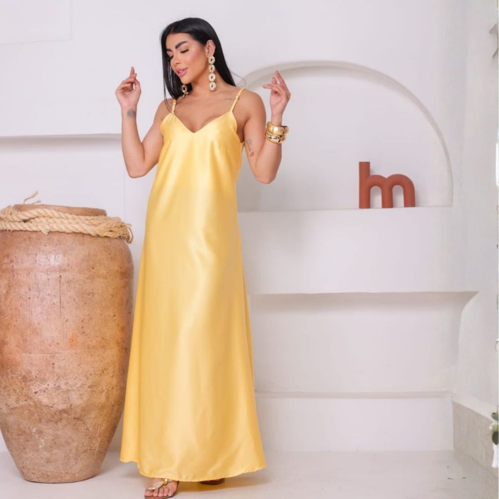 Vestido Feminino Cetim Longo Seda Elegante Semi - Brilho Evasê Alcinhas Modelagem Justa