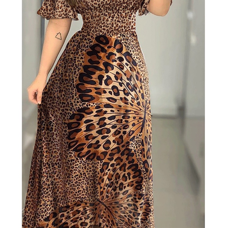 Vestido Feminino Com Estampa De Borboleta E Leopardo Ombro Manga Folha De Lótus Saia Longa