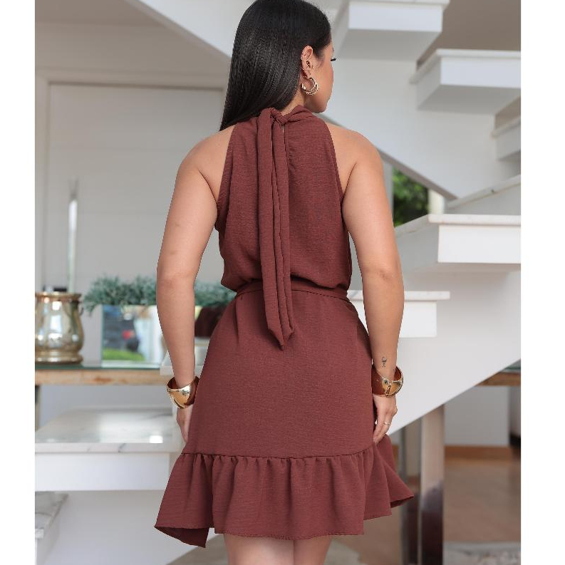 Vestido Feminino Curto Gola Halter Amarração No Pescoço Soltinho Tendência Chic Elegante