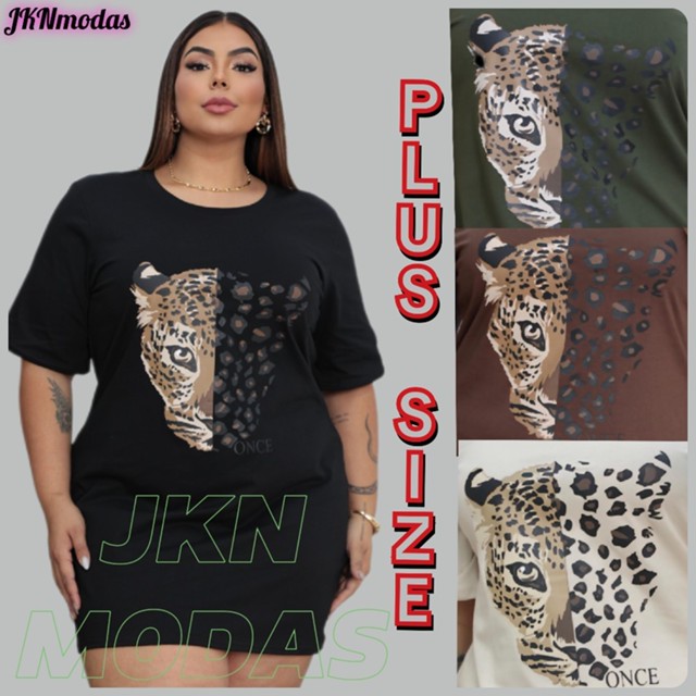 VESTIDO Feminino curto PLUS SIZE Estampa ONÇA CURVE CURVY100% Algodão Manga Curta Moda Gringa