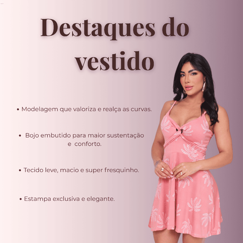 Destaque-se com este vestido feminino curto e soltinho, feito em tecido Premium, que proporciona leveza, conforto e caimento perfeito. Possui bojo estruturado e alças finas ajustáveis, ideal para valorizar o busto e garantir sustentação com elegância. Perfeito para o dia a dia, passeios e ocasiões casuais. Detalhes do produto: • 💖 Tecido: Premium (96% poliéster / 4% elastano) • 👗 Modelagem: soltinha e confortável • ✨ Possui bojo e alças finas • 🌸 Estampa moderna e exclusiva • 🧵 Costura reforçada e acabamento premium Tamanho disponível: • Único – veste P e M (36 ao 40) ✅ 📦 Envio Rápido: Seu pedido será enviado em até 24 horas após a confirmação do pagamento. 💬 Dúvidas? Estamos à disposição no chat para esclarecer qualquer questão e tornar sua experiência de compra a melhor possível.